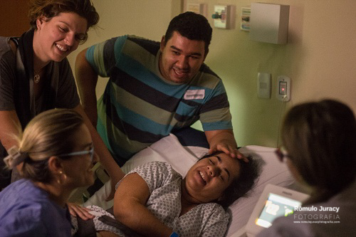 O clima no quarto era o melhor possível... Meia luz, o ar estava confortável, estávamos conversando e rindo... Em nada parecia clima de hospital. Meu marido, a enfermeira obstétrica, a doula, o fotógrafo, a médica, todos num clima de alegria e expectativa...